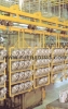 Similar to trolley conveyor due to use of discretely spaced carriers transported by an overhead chain; however, the power-and-free conveyor uses two tracks: one powered and the other nonpowered (or free) Carriers can be disengaged from the power chain and accumulated or switched onto spurs. Termed an Inverted Power-and-Free Conveyor when tracks are located on the floor.